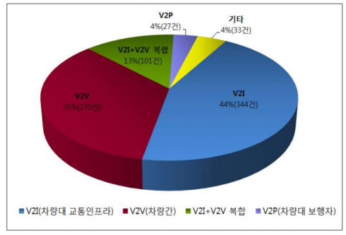 지난 10년간 V2X 통신 관련 특허출원 775건을 분야별로 살펴보면 차량-교통인프라간 통신 V2I 분야 출원이 44%, 차량-차량간 통신 V2V 분야 출원이 35%, V2I+V2V 복합 분야 출원이 13%, 차량-보행자간 통신 V2P 분야 출원이 4%를 차지하고 있다.