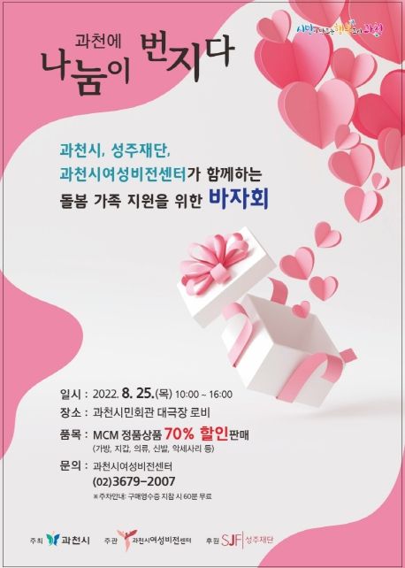 (비전21뉴스) 과천시는 과천시여성비전센터, 성주재단과 함께 오는 25일 과천시민회관 대극장 로비에서 돌봄 가족 지원을 위한 바자회를 연다고 19일 밝혔다.