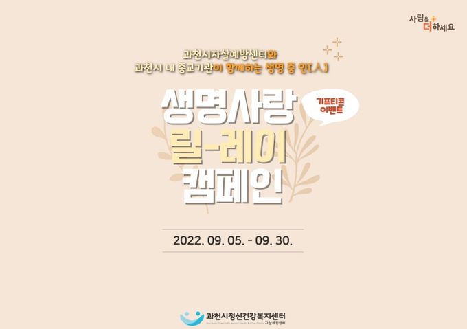 캠페인은 과천시정신건강복지센터 홈페이지를 통해 온라인 정신건강 자가검진, 생명사랑 퀴즈 이벤트, 따뜻한 응원의 쪽지 쓰기 등으로 진행된다.