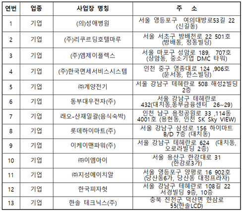 미이행 사업장 중 영유아보육법에서 공표 제외로 규정한 경우와 특별고용지원 업종, 회생절차 중인 사업장 등 명단공표 심의위원회가 공표 제외 대상으로 심의·의결한 사업장은 공표 명단에서 제외했다.