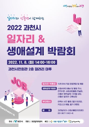 (비전21뉴스) 시는 침체된 채용시장에 활기를 불어넣고, 구인·구직난 극복을 위해 오는 8일 시민회관 2층 갤러리마루에서 오후 2시부터 ‘2022 과천시 일자리·생애설계 박람회’를 개최한다.