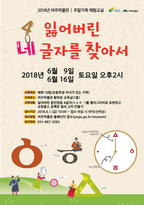 오는 9일과 16일 오후 2시에는 기획전시 ‘명불허전’ 캘리그라피 전시회와 연계하여 훈민정음 28자 중 지금은 사용하지 않는 4글자를 캘리그라피로 표현하고, 슈링클스 공예로 열쇠고리를 만드는 체험을 한다. 슈링클스는 그림을 그리고 오븐에 구우면 크기가 줄어들고, 두께는 늘어나는 신기한 마술종이로 남녀노소 누구나 쉽고 재밌게 즐기며 잃어버린 훈민정음 4글자를 찾는 의미 있는 시간이 될 것이다. 접수 방법은 1일 오전 10시부터 여주박물관 홈페이지에서 신청하면 된다.
