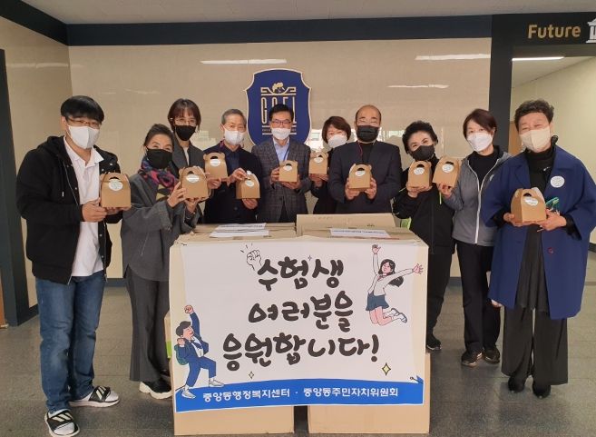 성영주 과천시 중앙동장은 “코로나19 장기화로 힘든 상황 속에서 열심히 수능을 준비해온 학생들을 격려하고 응원하기 위해 응원물품을 준비했다. 수험생들이 최선을 다해 좋은 결과를 얻을 수 있기를 바란다”라고 말했다.
