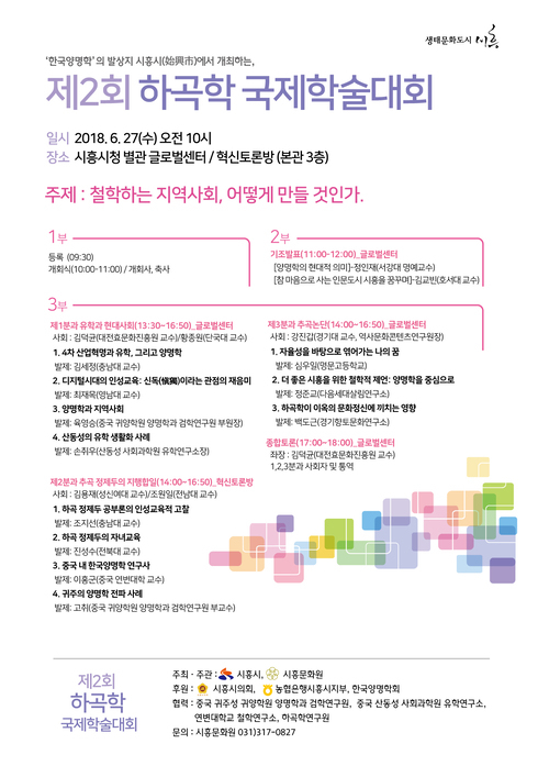 정원철 원장은 “작년에 이어 하곡 정제두 선생의 인문철학정신을 담은 학술대회를 열어 매우 기쁘고, 지역사회와 현대인의 삶에 있어 양명학의 역할과 미래지향적인 발전을 모색하는 계기가 될 것이라고 기대한다. 이를 위해 협조를 아끼지 않은 한국양명학회, 중국 귀주성 귀양학원 양명학과 검학연구원, 산동성 사회과학원 유학연구소, 연변대 철학연구소, 하곡학연구원, 그리고 시흥 양명학연구학회 관계자 등 참여해주시는 학자들께 감사드린다”고 했다.