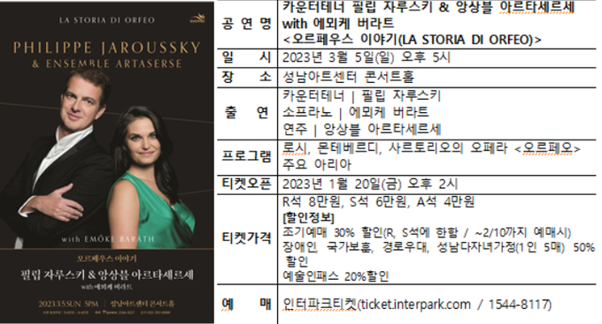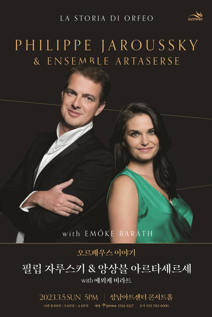 성남문화재단이 카운터테너 필립 자루스키와 소프라노 에뫼케 버라트, 앙상블 아르타세르세와 함께하는 <오르페우스 이야기> 공연을 오는 3월 5일(일) 오후 5시 성남아트센터 콘서트홀에서 개최한다.