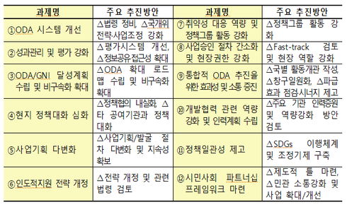 정부는 내년도 시행계획에서 그간 지적받아 온 ODA 종합전략 부족, 유·무상 원조 연계부족, 무상원조 분절화 등의 문제를 개선하기 위해 전략수립 및 ODA 사업 조정·통합 기능 강화 등을 포함한 ODA 추진체계를 개선해 나가기로 했다.