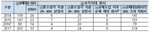 사각지대에 속한 회사들의 경우 규제 도입 전후 지분 매각, 비상장회사 상장 등을 통해 규제를 회피했다고 의심되는 사례들이 많았다.
