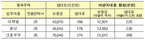 행복주택은 주변 시세의 60∼80%로 공급하고 있어, 시세가 상대적으로 높은 서울 지역도 전용 26㎡의 경우 보증금 4천만 원 내외, 월 임대료 10만 원대로 거주가 가능하다.