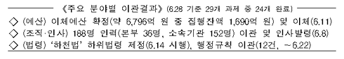 국토교통부의 수자원 기능을 환경부로 이관하는 작업은 정부조직법 시행일인 지난 8일 기준으로 대부분 완료하였으며, 정보시스템 등 일부 예산이 소요되는 부분은 추가계획을 수립한 후 추진할 예정이다.