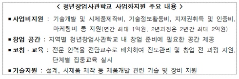 청년창업사관학교는 우수한 아이디어를 보유한 청년창업자를 창업교육부터 시제품제작, 해외진출, 투자 등 사업화 전단계에 걸쳐 집중 지원하여 혁신적인 청년CEO로 양성하는 프로그램으로 최대 1억원의 사업비를 지원한다.