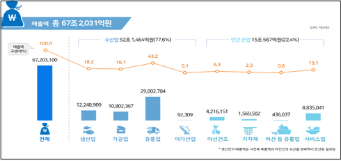수산업 총 매출액은 67조 2,031억원으로 이 중 일반 수산업 매출액은 약 52조 원, 연관산업 매출액은 약 15조 원으로 조사됐다.