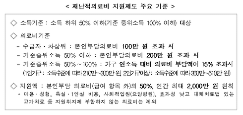 제도 시행에 따라, 7월부터 소득 하위 50% 이하에 해당하는 국민은 질환의 구분 없이 소득대비 과도한 의료비가 발생한 경우 연간 최대 2,000만원까지 의료비 지원을 받을 수 있게 된다.