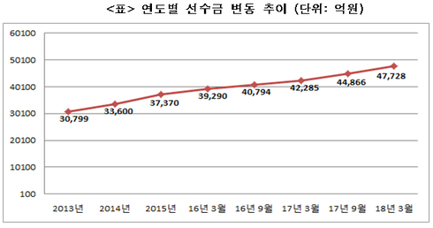 총 선수금은 4조 7,728억 원으로 지난 2017년 하반기 정보 공개 대비 2,862억 원이 증가했다.