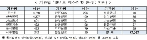 산업부 산하 17개 에너지공기업의 연구개발 예산은 지속적으로 증가해 ’18년도 예산은 총 1조 2,082억원으로, 산업부의 에너지 연구개발 예산규모를 넘는 국가 에너지 연구개발의 중요 부분으로 성장했다.