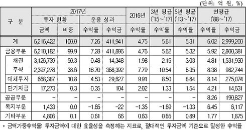 2017년 국민연금기금의 금융부문 운용 수익률은 7.28%로 확정되었으며 이는 최근 5년 간 가장 높은 수익률이다.