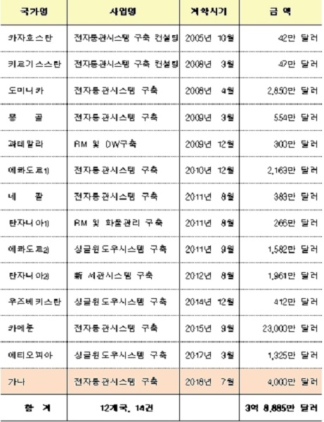 이번 계약은 우리나라의 정보통신기술을 기반으로 한 통관·화물·심사·위험관리 등 관세청 전자통관시스템 주요모듈을 구축하는 것으로, 한국 ICT 업체가 가나 현지에서 향후 25개월간 전자통관시스템 구축사업을 진행할 예정이며, 아프리카 수출은 탄자니아, 카메룬, 에티오피아에 이어 네 번째다.