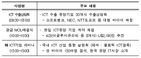 이번 행사는 최근 일본의 ‘미래투자전략’ 등 4차 산업혁명 성장전략의 적극적 추진과 함께 더욱 높아진 한국 정보통신기업에 대한 관심과 ‘2020 도쿄 올림픽’ 특수를 계기로 국내 중소기업의 판로를 확보하고 현지 취업을 활성화하기 위하여 마련됐다.