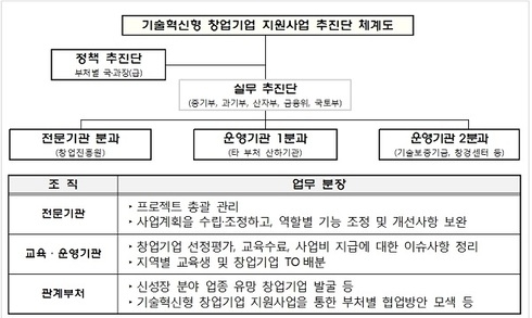 범부처 추진단은 앞으로 ‘기술혁신형 창업기업 지원사업’ 사업관리, 정책 수립·조정 및 산하기관 간 협력, 창업 기업 모집 선정과 창업기업 사업화 관리·운영 등의 업무를 수행하게 된다.