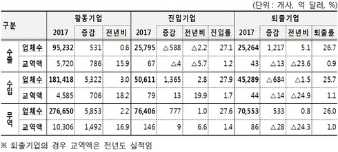 지난 2017년 기업무역활동 통계의 주요 내용을 살펴보면, 우리나라 무역활동기업 수와 무역액은 276,650개사, 10,306억 달러로 전년대비 각각 5,853개사, 1,492억 달러 증가했다.