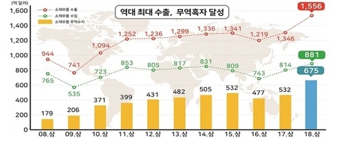 ‘18년 상반기 소재·부품은 수출 1,556억 달러, 수입 881억 달러, 무역흑자 675억 달러를 기록, 수출, 수입 및 무역흑자 모두 역대 최대 반기 실적을 달성했다.