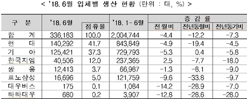 국내 자동차 생산은 일부 모델 생산중단, 국산차의 내수와 수출 부진 등으로 전년 동월대비 12.2% 감소한 336,183대 생산했으며, 내수 판매는 영업일수 감소 등으로 인한 판매 감소로 전체 내수는 전년 동월대비 5.5% 감소한 155,724대 기록했다.