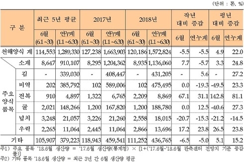 2018년도 상반기 주요 양식 수산물 수출액은 4억 5,048만 달러로, 작년 상반기 보다 10.5% 증가했다. 특히 주요 양식품목인 전복, 김, 굴의 수출액이 대체로 증가했다.