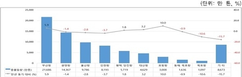 포항항, 부산항은 전년 동기 대비 각각 10.0%, 5.9% 증가하였으나, 목포항, 인천항은 각각 10.6%, 3.7% 감소했다.