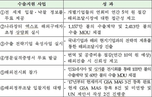 또한, 코트라와 업무협약을 체결하여 글로벌 공공조달 상담회를 공동으로 개최할 예정이며, 영문 실적증명서를 나라장터를 통해 무료로 제공하는 등 기업들의 수출지원을 위한 대내외적인 노력을 병행하고 있다.