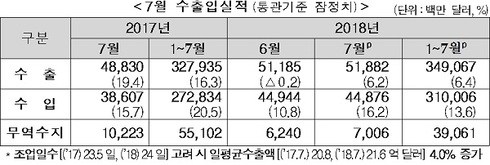 또한 1월∼7월 누적 수출은 전년동기비 6.4% 증가한 3,491억 달러로 사상 최대 실적을 거뒀다.