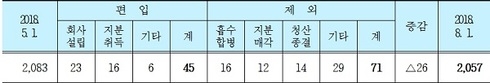 7월1일 현재 60개 대기업집단의 소속회사는 총 2,057개로 집계됐으며, 최근 3개월동안 소속회사는 45개가 증가하고, 71개가 감소하여 총 26개가 순감소됐다.