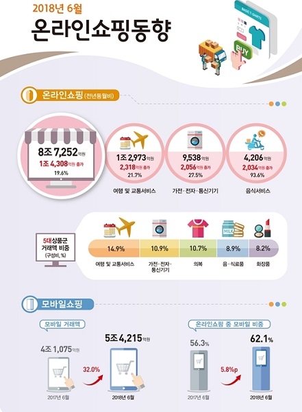 또한, 온라인쇼핑 거래액 중 모바일쇼핑 거래액 비중은 62.1%로 전년동월에 비해 5.8%p 증가했다.