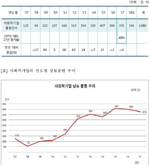 특허청에 따르면, 사회적기업 인증제도 시행 후 사회적기업의 상표출원 건수는 인증 초기인 지난 2007년에 125건에서 2017년에는 376건으로 3배가량 증가한 것으로 조사됐다.
