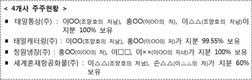 4개 회사는 조양호 회장의 처남 가족 등이 지분 대부분을 소유하고 있고, 대한항공, 진에어 등 '한진' 계열사에 기내용품을 납품하는 등 밀접한 거래 관계를 장기간 유지해 오고 있는 회사이다.