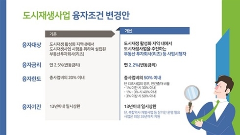 융자금리는 기존 연 2.5%에서 연 2.2%로 0.3%p 인하하고, 융자한도는 기존 총사업비의 20%에서 최대 50%까지 확대하여 금융비용을 절감할 수 있도록 지원하기로 하였으며, 또한, 복합역사 개발사업, 노후공공청사 재생사업 등 장기간 운영이 필요한 사업의 경우 융자기간을 기존 13년에서 최장 35년까지 연장할 수 있도록 했다.