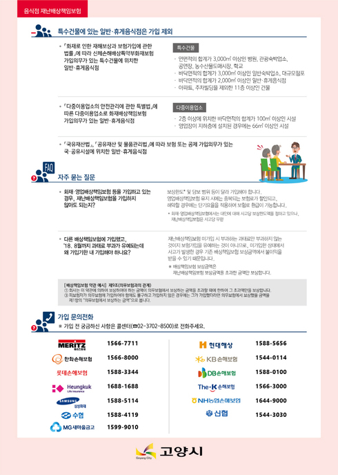 덕양구는 1층 100㎡이상 음식점 733개소와 숙박업소 80개소를 대상으로 현재 93% 가입한 상태며 아직 가입하지 않은 사업장에 대해 가입 안내문 발송, 유선안내 및 현장방문 안내 등으로 총력을 기울여 독려하고 있다.
