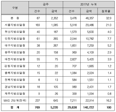 지역별 발주량을 보면 대전광역시 소재 본청 2,352억 원, 서울지방청 1,085억 원 등 2개청(3,437억 원)이 전체 금액(4,575억 원)의 75.1%를 차지하고 있으며, 부산 등 10개 지방청 1,138억 원이 각각 집행될 예정이다.