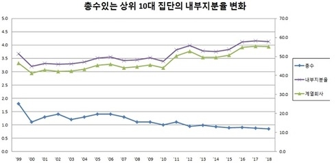상위 10대 집단의 내부지분율에 대해 20년간 추세를 보면 총수일가 지분율은 감소하는 반면 계열회사 지분율은 증가하여 뚜렷한 대조를 보인다.