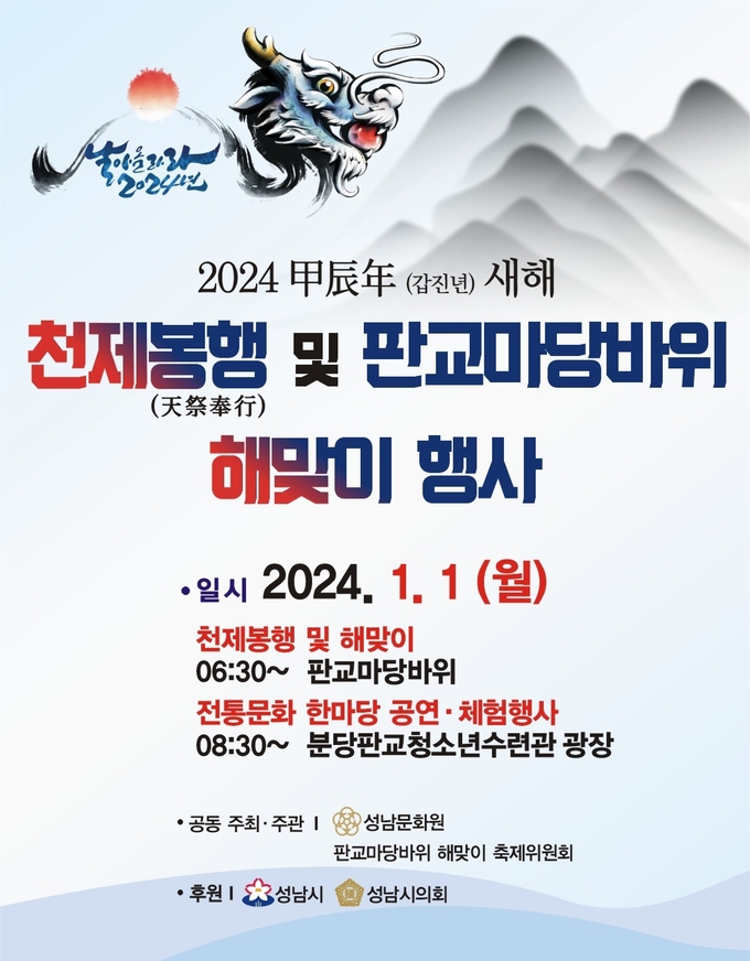 (비전21뉴스=정서영 기자) 성남문화원(원장 김대진)과 판교 마당바위 해맞이축제위원회(위원장 유은경)」은 갑진년 새해를 맞아 「2024년 갑진년 새해 천제봉행(天祭奉行) 및 판교마당바위 해맞이 행사」를 2024년 1월 1일 오전 6시 30분부터 판교마당바위에서 개최한다.