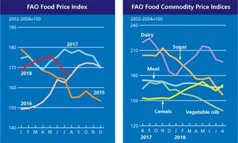 식량가격지수는 2018년 5월부터 보였던 하락세에 전환하여 올해 초 수준에서 안정을 유지했다.
