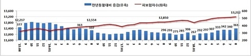 제조업은 전체 8월 피보험자는 전년동월대비 1만명 증가했고, 구조조정 중인 ‘기타운송장비’ 업종 제외시 2만 7천명 증가했다.