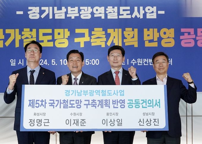 신 시장은 이날 이재준 수원시장, 이상일 용인시장, 정명근 화성시장과 함께 서명식을 열고 서울 잠실에서 시작해 성남을 거쳐 용인, 수원, 화성으로 이어지는 경기남부광역철도 노선 관철을 위한 공동건의문을 채택했다.