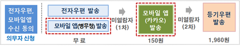 모바일 통지서는 1차로 병무청 앱을 통해 발송하고, 병무청 앱에서 통지서를 확인하지 않을 경우 2차로 카카오 알림톡으로 통지서를 송부하여 통지서 미확인으로 인해 발생할 수 있는 병역의무자의 불이익을 방지할 예정이다.