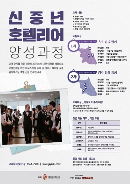 ‘신중년 호텔리어’란 프런트오피스, 하우스키핑 등 호텔직무에 대한 전문 능력과 서비스 매너를 갖춘 시니어 호텔 인재를 뜻한다. 강원도에 거주하고 호텔 취업을 희망하는 경력단절 여성과 중년은 누구나 신청할 수 있다. 선발인원은 교육과정별 20명이고, 수강료는 무료다.