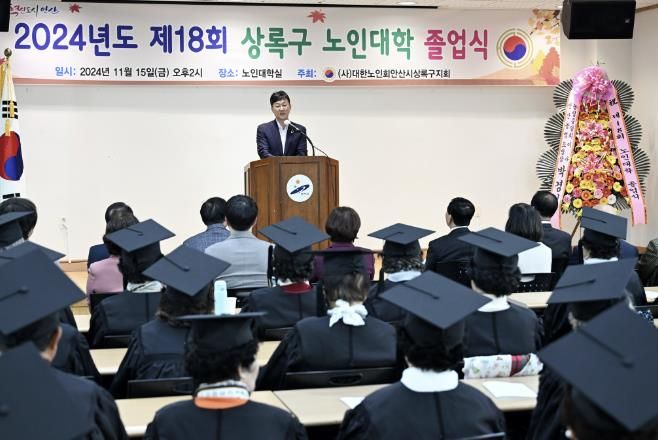 이날 졸업식에는 60명의 노인대학 졸업생과 이민근 안산시장을 비롯한 내빈 등 80여 명이 참석한 가운데 졸업장 수여 및 모범상 등의 시상과 축사, 격려사 순으로 진행됐다.