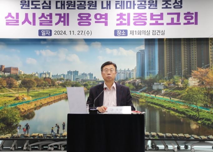 중원구 하대원동 일대에 위치한 대원공원은 2022년 4월 대원근린공원 재정비 계획수립 이후 2023년 주민설명회를 거쳐 테마공원 조성을 위한 실시설계 용역을 착수, 오늘 최종보고회를 실시했다. 대원공원 내 테마공원은 2025년 내 준공을 목표로 추진 중에 있다.