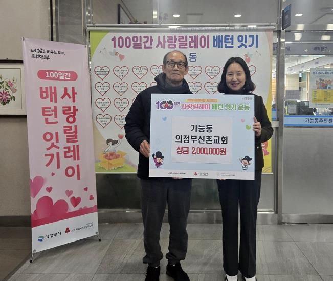 (비전21뉴스) 의정부시 가능동주민센터는 12월 9일 의정부신촌교회가 다문화가정을 지원하고자 성금 200만 원을 기탁하며 ‘100일간 사랑릴레이 배턴 잇기’에 동참했다고 밝혔다.