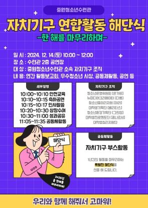 이번 연합 해단식은 중원청소년수련관 소속 청소년 자치기구가 한 자리에 모여 연간 활동을 공유하고 서로 격려하는 자리다. 약 100여명의 청소년들이 참여하며, 활동 성과 발표와 축하공연, 우수 청소년 시상 등 다양한 프로그램을 통해 한 해를 뜻깊게 마무리할 예정이다.