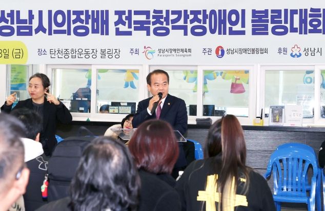 (비전21뉴스) 성남시의회 이덕수 의장이 지난 13일 탄천종합운동장 볼링장에서 열린 성남시의장배 전국청각장애인볼링대회에 참석했다.