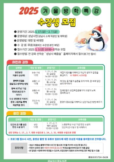 한편, 수강 신청은 성남시 평생학습 통합플랫폼 배움숲에서 선착순 가능하다.