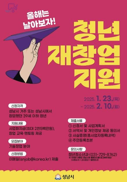 (비전21뉴스=정서영 기자) 성남시는 오는 2월 10일까지 청년 재창업 지원사업 참여자 9개 팀(팀별 1~2명)을 모집한다.